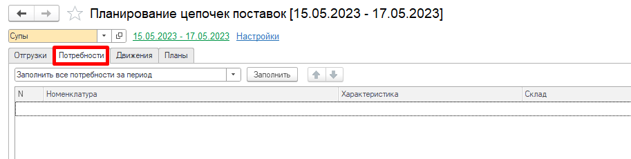 Заполним потребности к отгрузке, перейдем на вкладку Потребности