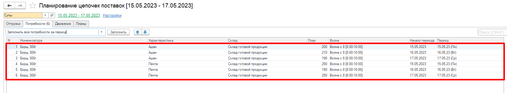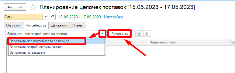 - Заполнить все потребности за период - заполняет потребности к отгрузке на заданный в сценарии период. Отобразяться все потребности запланированные на вклаке Отгрузки.