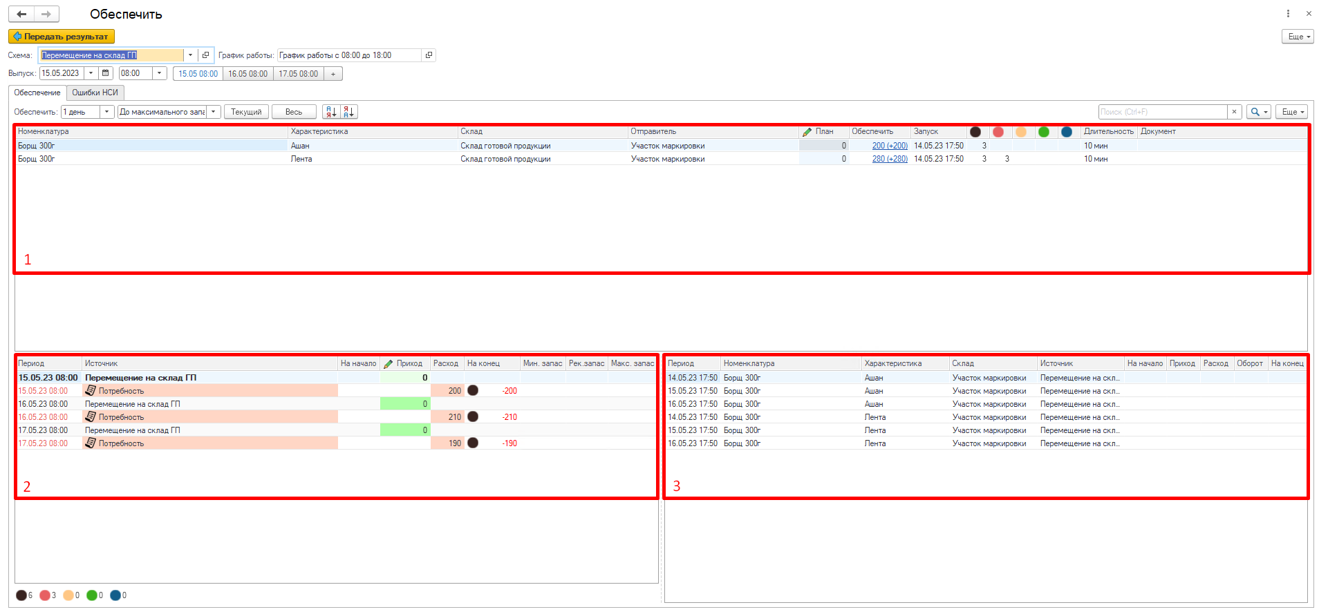 В табличной части 1 видим нашу потребность, в части 2 отображается движение продукции, а в части 3 материалы, которые необходимы для обеспечения выбранной строчки.