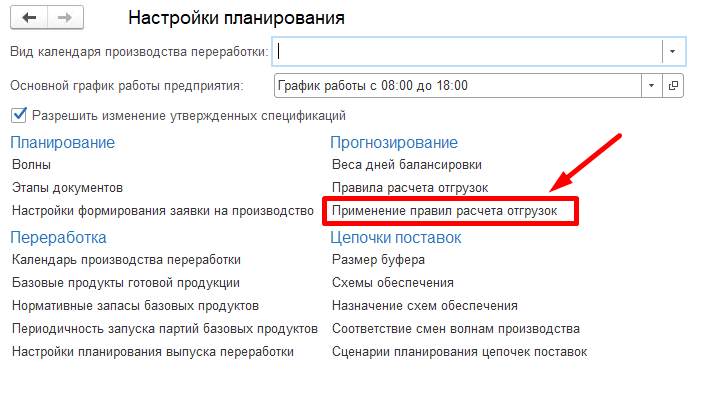 Для их создания перейдем в "Настройки планирования" - "Применение правил расчета отгрузок".