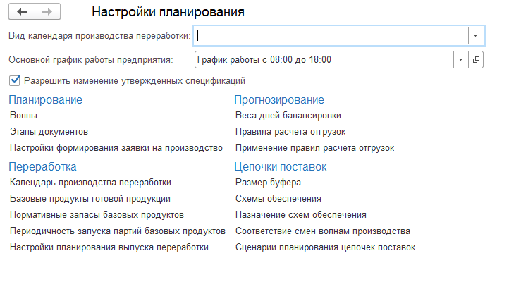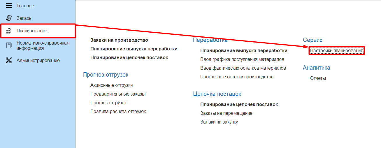 Для заполнения настроек планирования используются "Настройки планирования", которые расположены в разделе "Планирование" в подсистеме "Сервис" - "Настройки планирования".