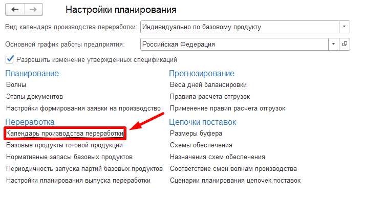 Для его заполнения перейдем в "Настройки планирования" - "Календарь производства переработки".