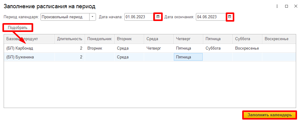 Заполняем Дата начала и Дата окончания. По кнопке "Подобрать" добавляем позиции базового продукта, указываем день недели с учетом длительности. Например, если длительность - 2, то при запуске в Понедельник, выпуск происходит во Вторник.