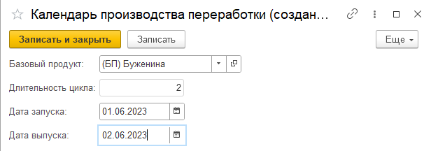 - Длительность цикла - длительность производственного цикла, подставляется автоматически из настроек номенклатуры;
