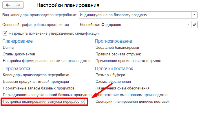Для их заполнения перейдем в "Настройки планирования" - "Настройки планирования выпуска переработки".