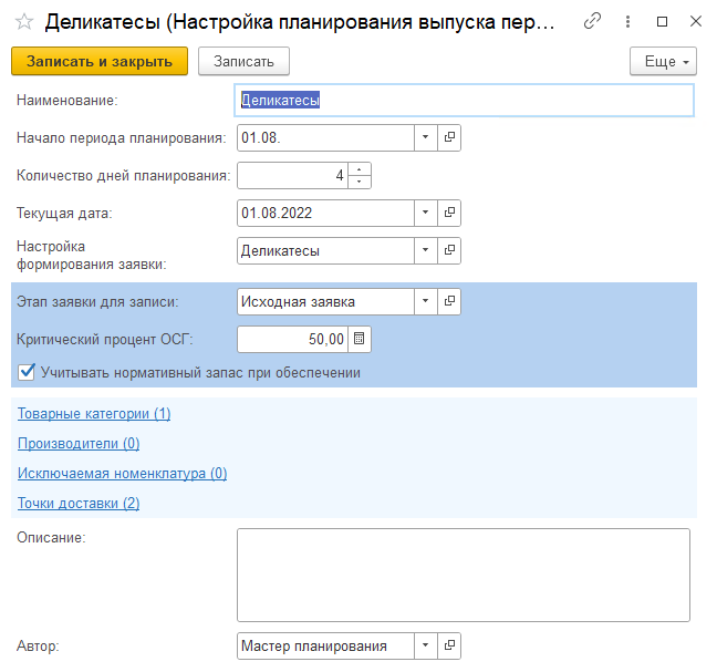 Затем настраиваются отборы, по которым будет происходить планирование. В системе есть возможность задать товарные категории, производителей, исключаемые номенклатуры и точки доставки. При указании определенных вариантов только они будут учитываться при планировании.