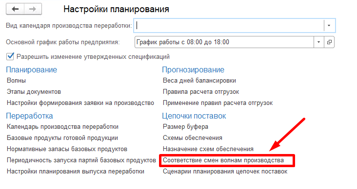 Для заполнения перейдем в "Настройки планирования" - "Соответствие смен волнам производства".