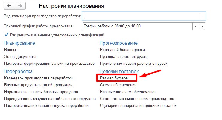 Для заполнения буфера перейдем в "Настройки планирования" - "Размер буфера".