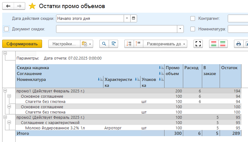 Отслеживать остаток промо объема удобно отчетом "Остатки промо объемов"