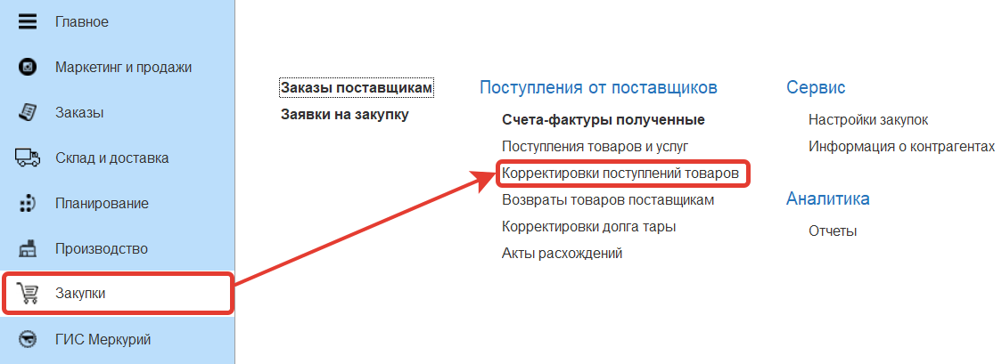 Для внесения исправлений в документы "Поступления товаров" используются документы "Корректировка поступлений товаров". Они расположены в разделе "Закупки".