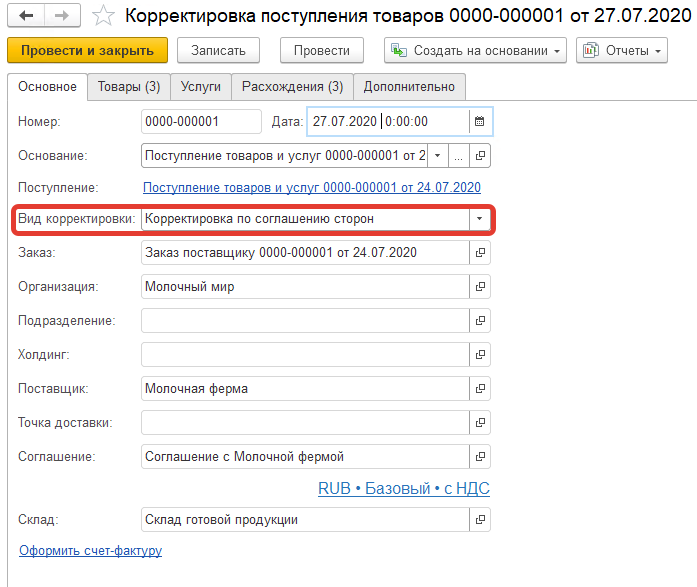 - Основание: поступление товаров или корректировка поступления товаров. Документ "Корректировка поступлений товаров" может создаваться на основании "Почтупления товаров" или другого документа "Корректировка поступления товаров"