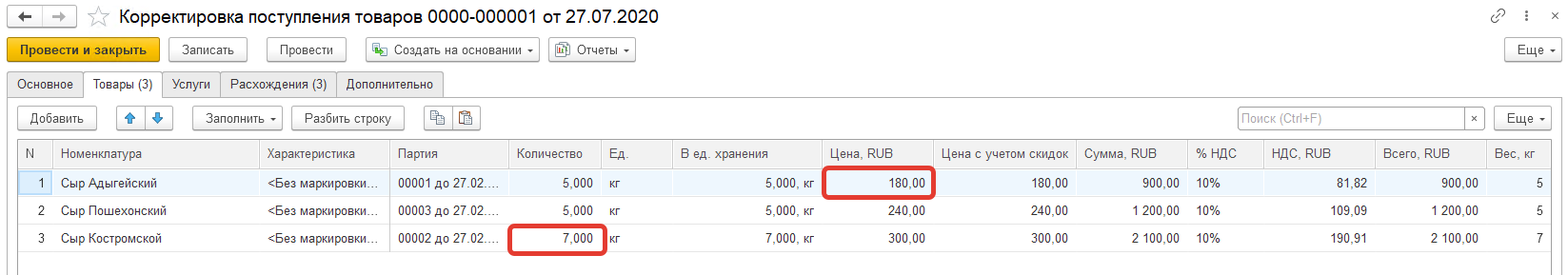 Создадим корректировку для поступления товаров, которое было создано первым по заказу на 24.07.2020