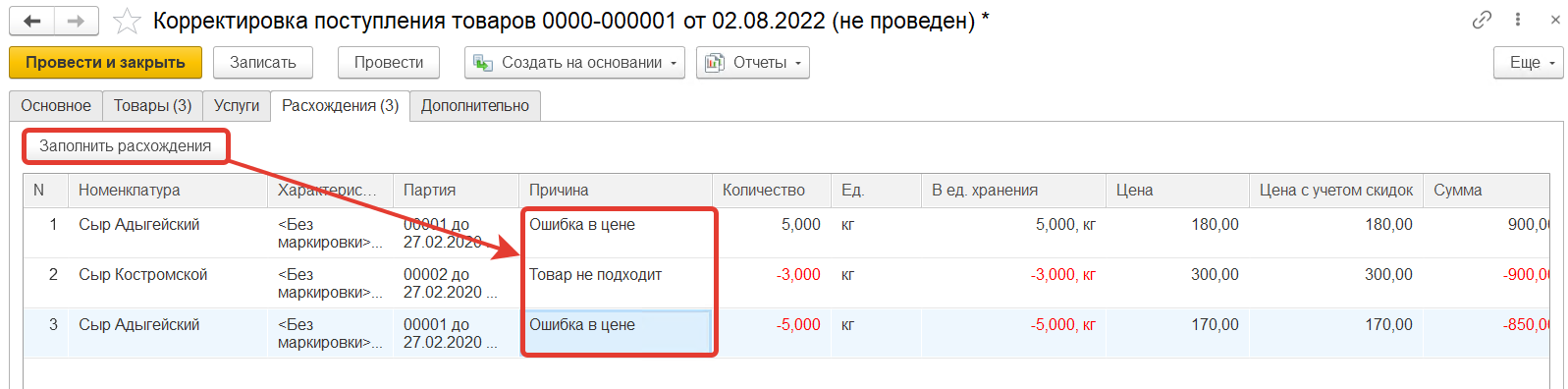 На вкладке "Расхождения" заполняем с помощью кнопки "Заполнить расхождения" расхождения товаров, указываем причины корректировок - создаются в справочнике "Причины корректировок документов"