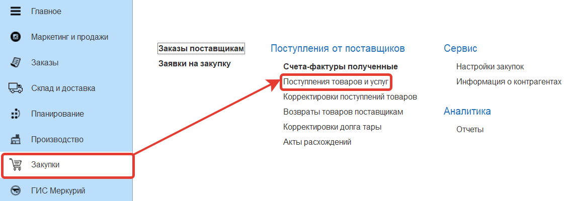 Документы "Поступления товаров" отражают процесс принятия товаров от поставщика. Они расположены в разделе "Закупки".