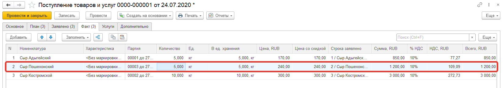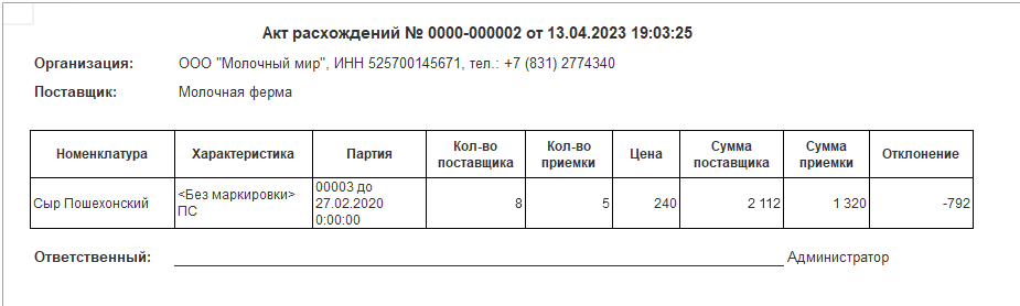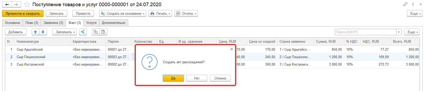 Будет предложено создать документ "Акт расхождений" т.к. между плановым и фактическим количеством Сыра Пошехонского была разница: