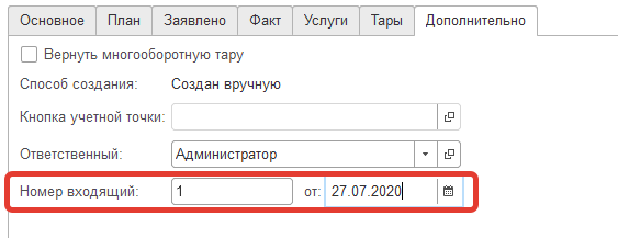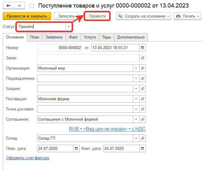 На вкладке "Дополнительно" заполним номер и дату накладной. Затем изменим статус на "Принято" и проведем документ с закрытием. "Акт расхождений" создан не будет, так как план равен факту.