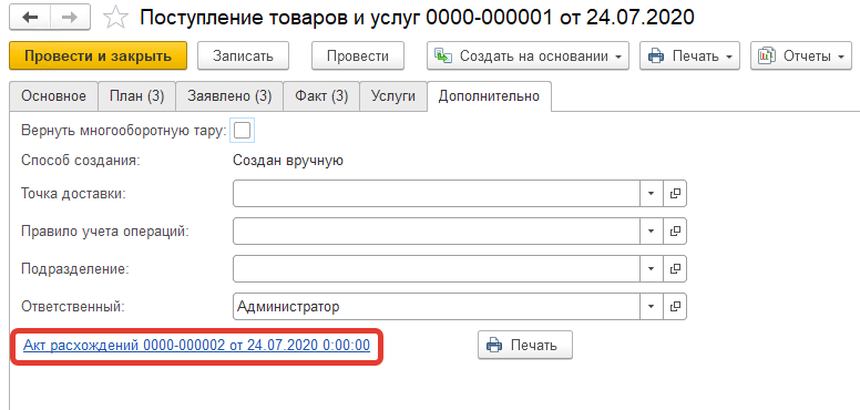На вкладке "Дополнительно" появится гиперссылка на документ "Акт расхождений"