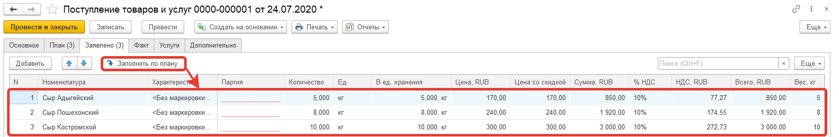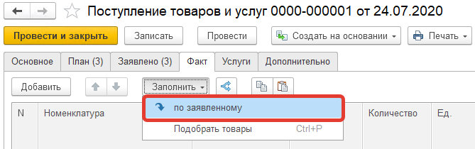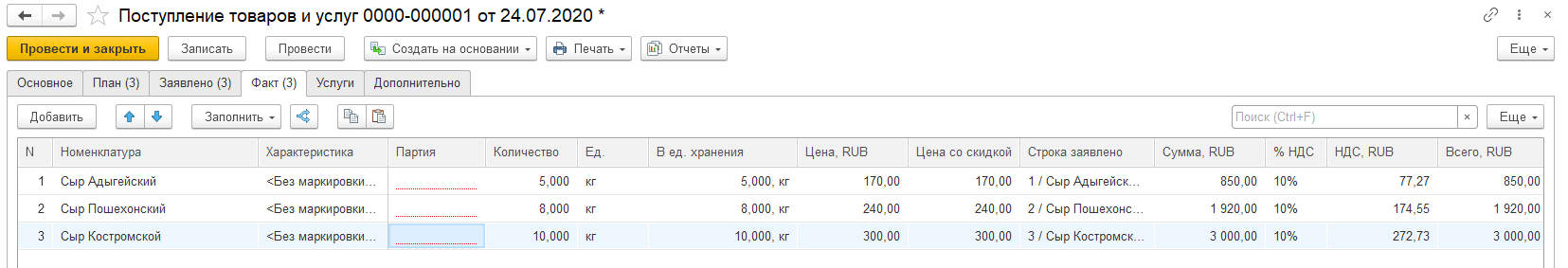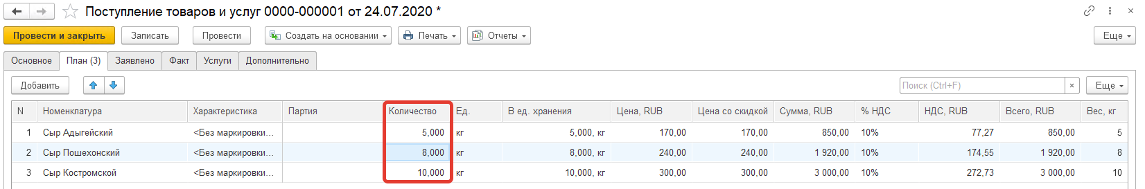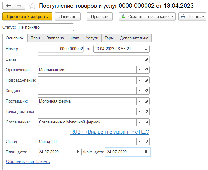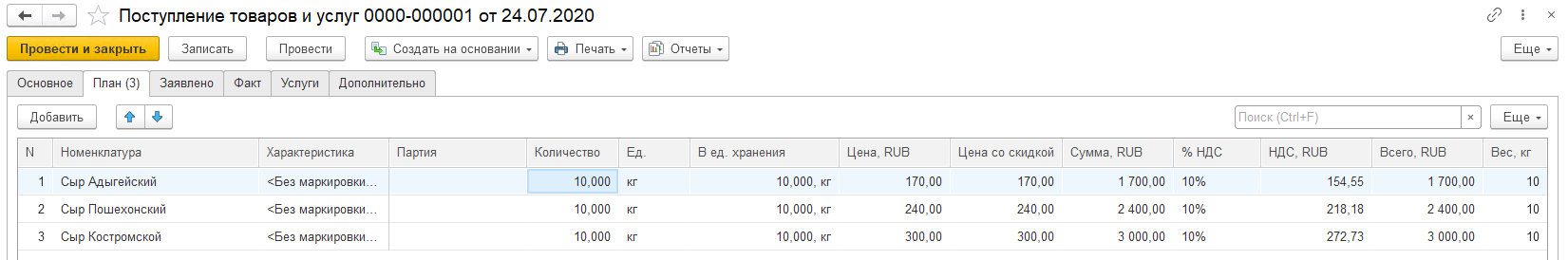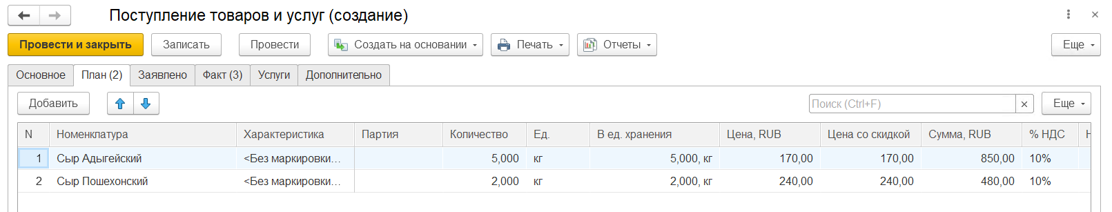 Отражает количество товара, которое поставщик планирует нам отгрузить. Заполняется номенклатура, её характеристика, количество, упаковка, цены рассчитываются автоматически на основании соглашения с поставщиком. Если "Поступление товаров" создается на основании "Заказа поставщику", то вкладка "План" заполняется автоматически, на ней можно скорректировать данные.