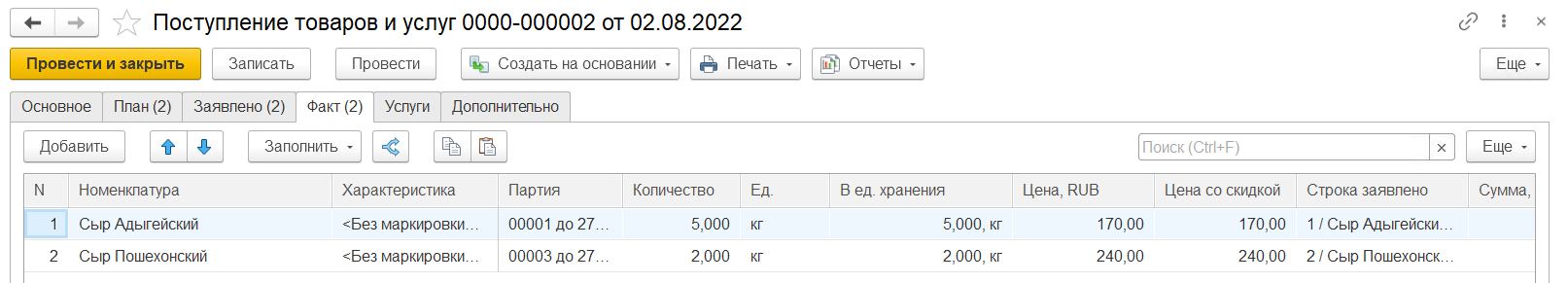 Отражает количество товара, которое поступает от поставщика. Заполняется номенклатура, её характеристика, количество, упаковка, цены рассчитываются автоматически на основании соглашения с поставщиком. Факт может быть заполнен вручную, а может на основании заявленного.
