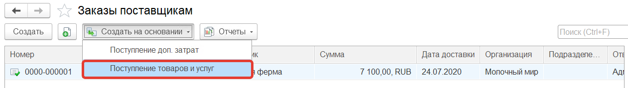 Рассмотрим создание "Поступления товаров" на основании "Заказа поставщику". Переходим к заказам поставщикам, выбираем заказ на 24.07.2020 и нажимаем на кнопку создания на основании: