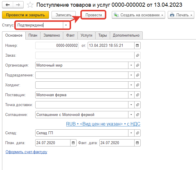 Установим статус "Подтверждено", установится фактическая дата поставки. Проведем документ:
