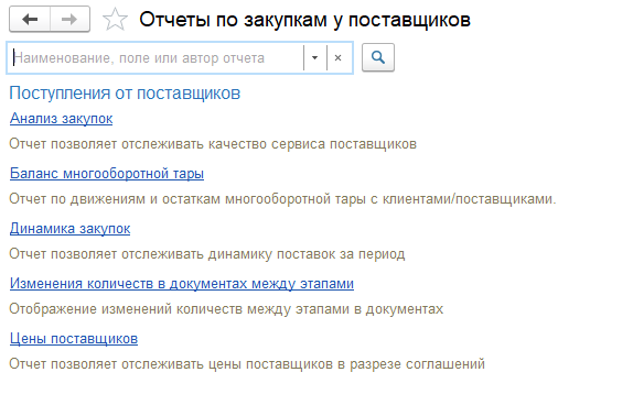 Для мониторинга закупок предусмотрены отчеты "Анализ закупок", "Динамика закупок" и "Цены поставщиков". Они расположены в разделе "Закупки" в подсистеме "Аналитика" - "Отчеты".