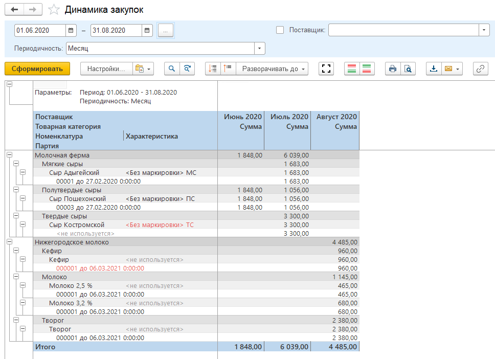 Сформируем отчет за период 01.06.2020 - 31.08.2020: