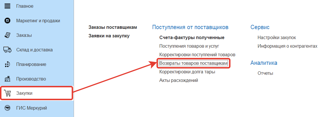 Документы "Возврат товаров поставщику" отражают возвраты товаров. Они расположены в разделе "Закупки".