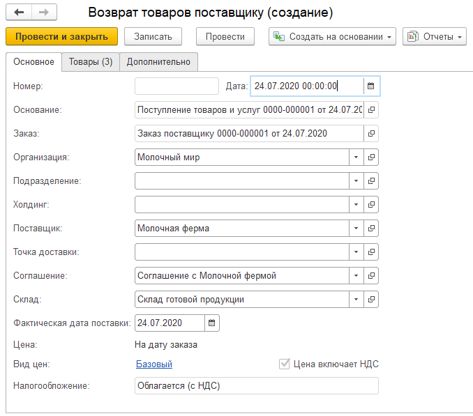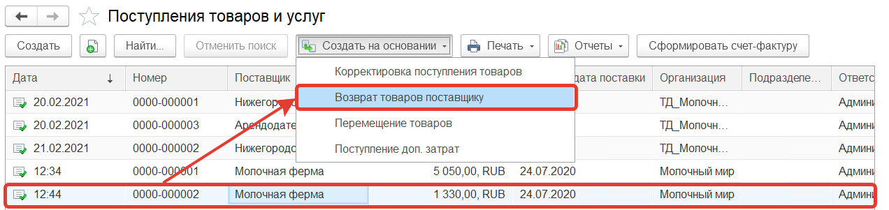 Создадим "Возврат товаров поставщику" на основании поступления товаров, которое было создано вторым по заказу на 24.07.2020