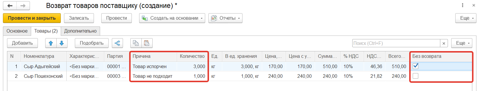 На вкладке "Товары" указываем возвращаемые товары, предварительно создав причины возврата - Товар испорчен и Товар не подошел: