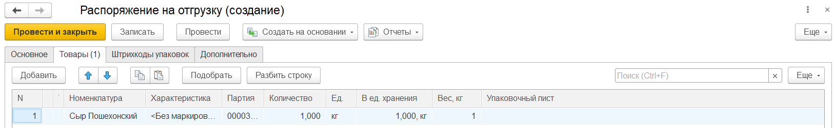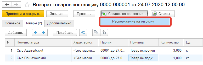 На основании "Возврата товаров поставщику" создаем распоряжение на отгрузку: