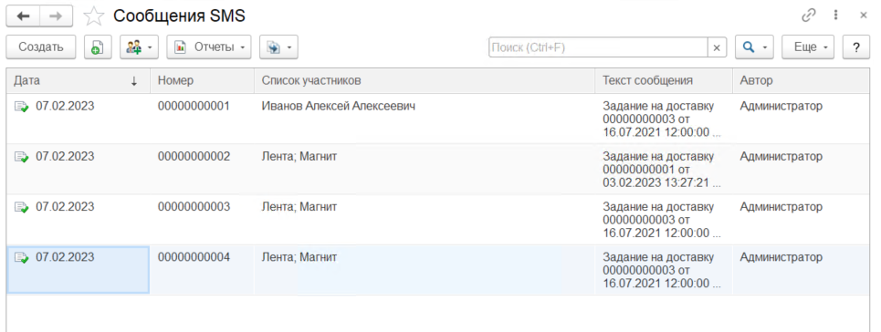 После выполнения регламентного задания "Формирование сообщений для рассылок" сформируются электронные письма и смс в статусах Исходящее в зависимости от настроек