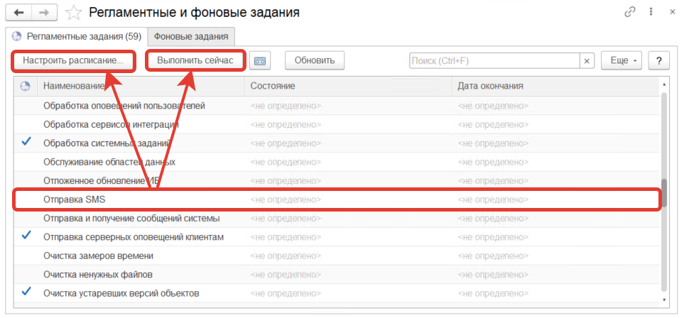 За отправку SMS отвечает регламентное задание "Отправка SMS", для него можно настроить расписание или выполнить его вручную.
