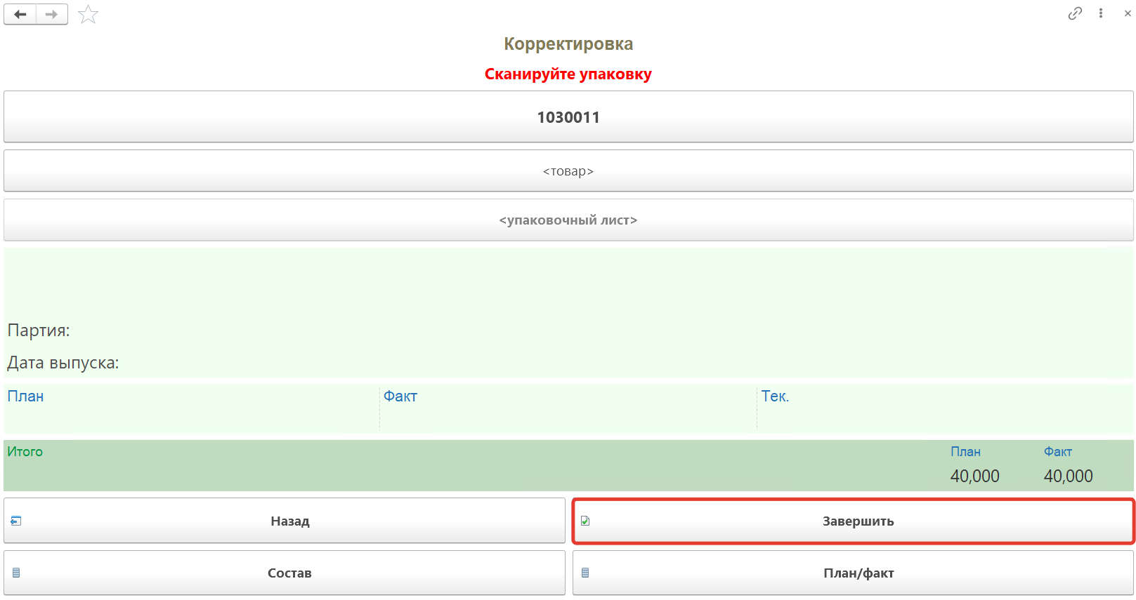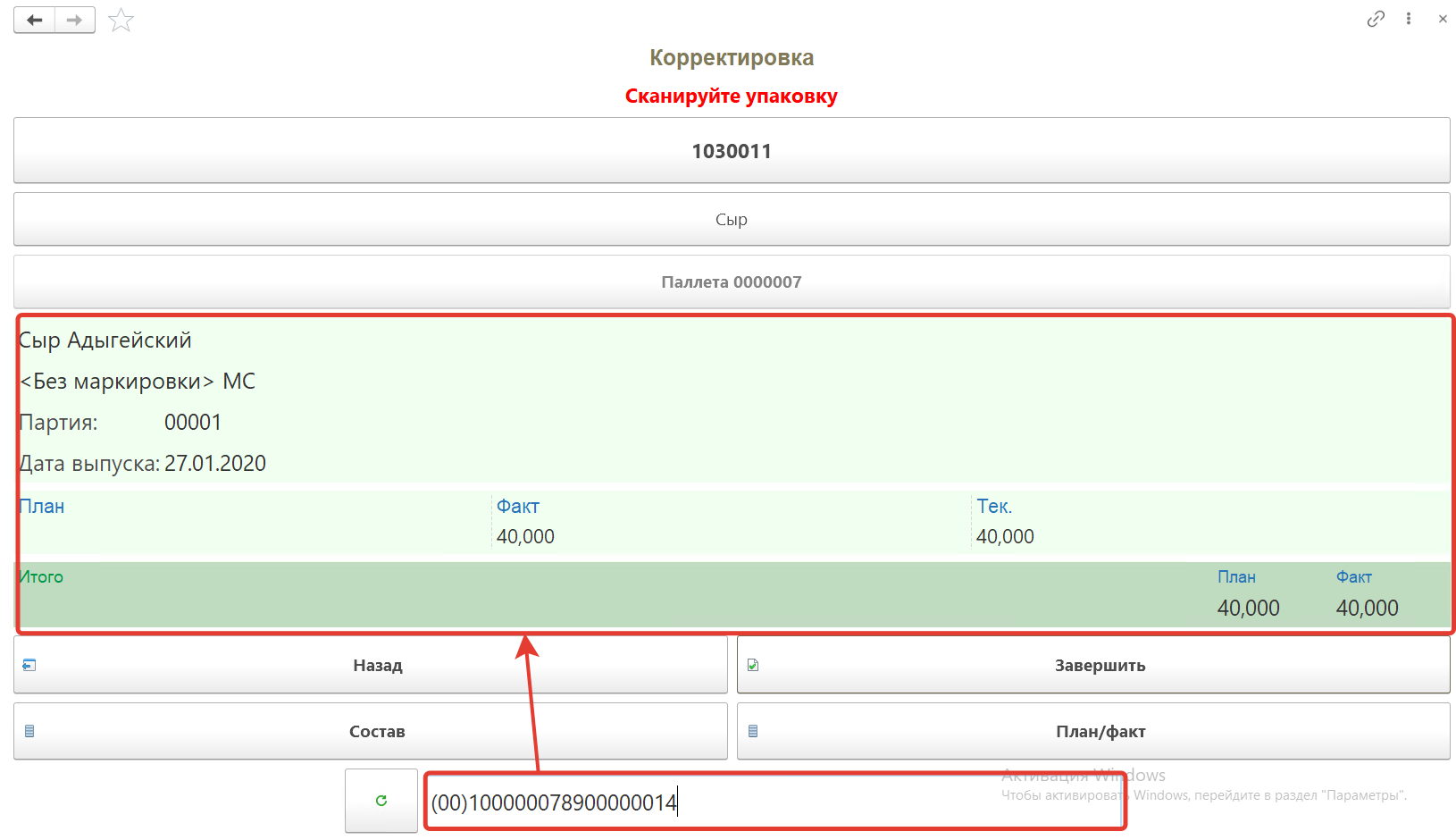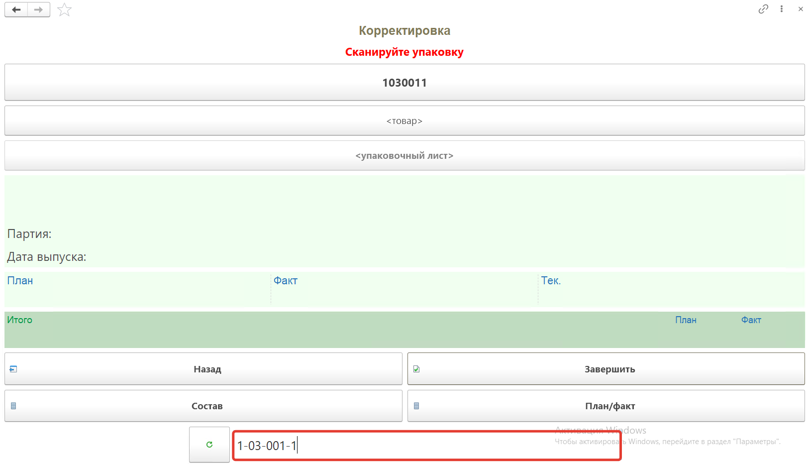 Далее сканируем штрихкоды коробов расположенных в этой ячейке, номенклатура появится на форме. Появится количество фактически отсканированного товара по плану и по факту.