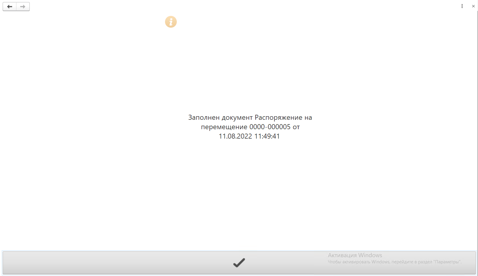 В "Распоряжении на перемещение" заполнится вкладка "Факт" и документ будет переведен в статус "Выполнено", нажимаем на кнопку "Галочка".
