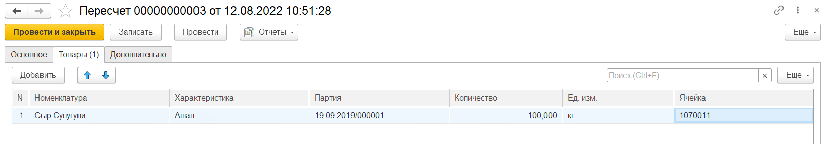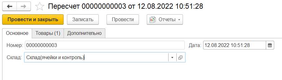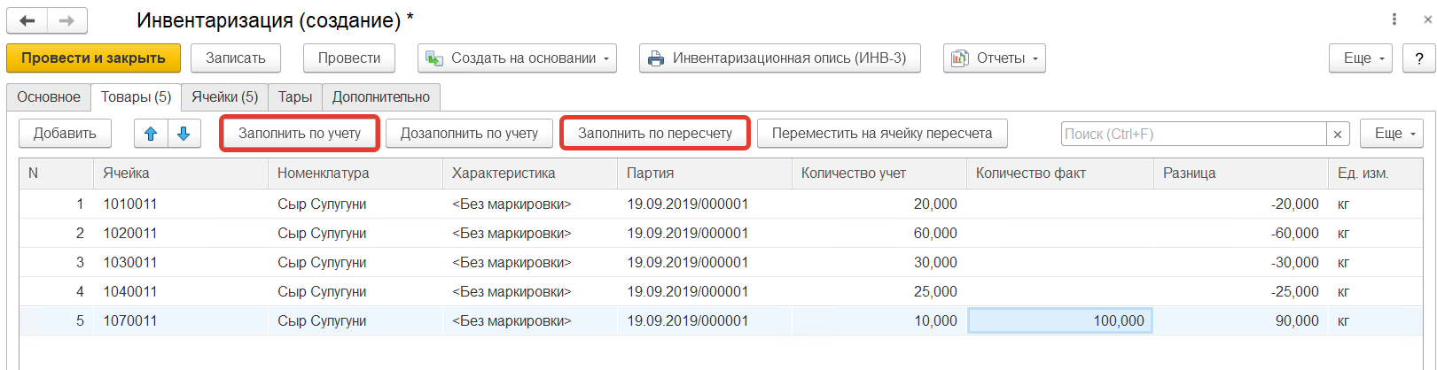На вкладке "Товары" сначала нажать по кнопке "Заполнить по учету" будет выполнено заполнение строк с учетом пересчета. Далее нажать по кнопке "Заполнить по пересчету" будет выполнено заполнение колонки "Количество факт"