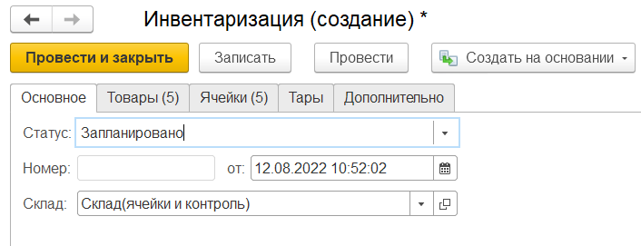 Сохраняем документ и переходим к Инвентаризации. Документ "Инвентаризация" расположен в разделе "Склад и доставка" в подсистеме "Складская логистика".