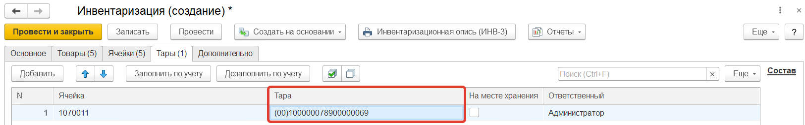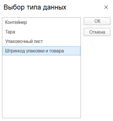 Для заполнения тары нужно перейти на вкладку "Тары" нажать на кнопку "Добавить" и указать тип данных "Штрихкоды упаковок и товаров"