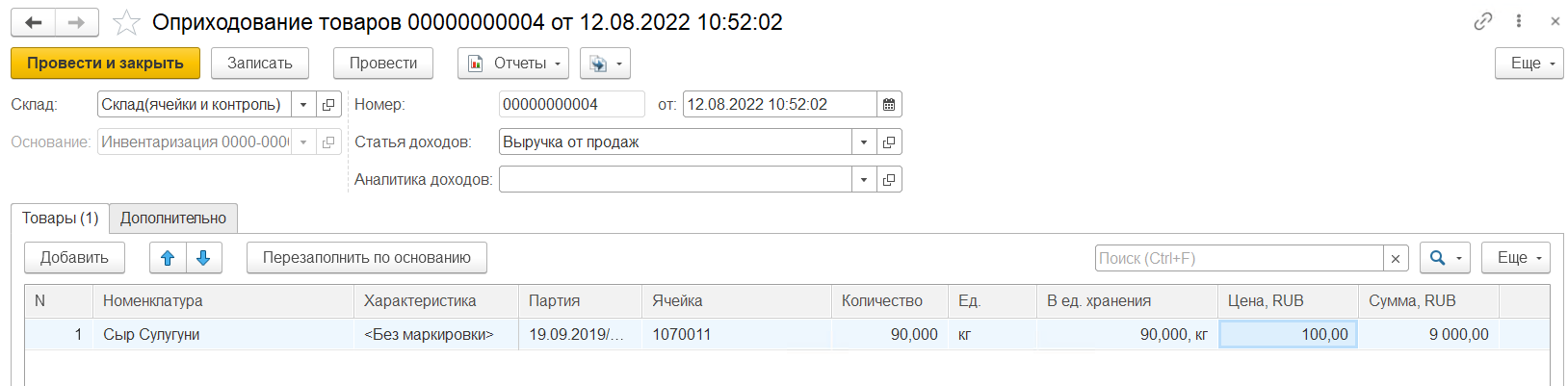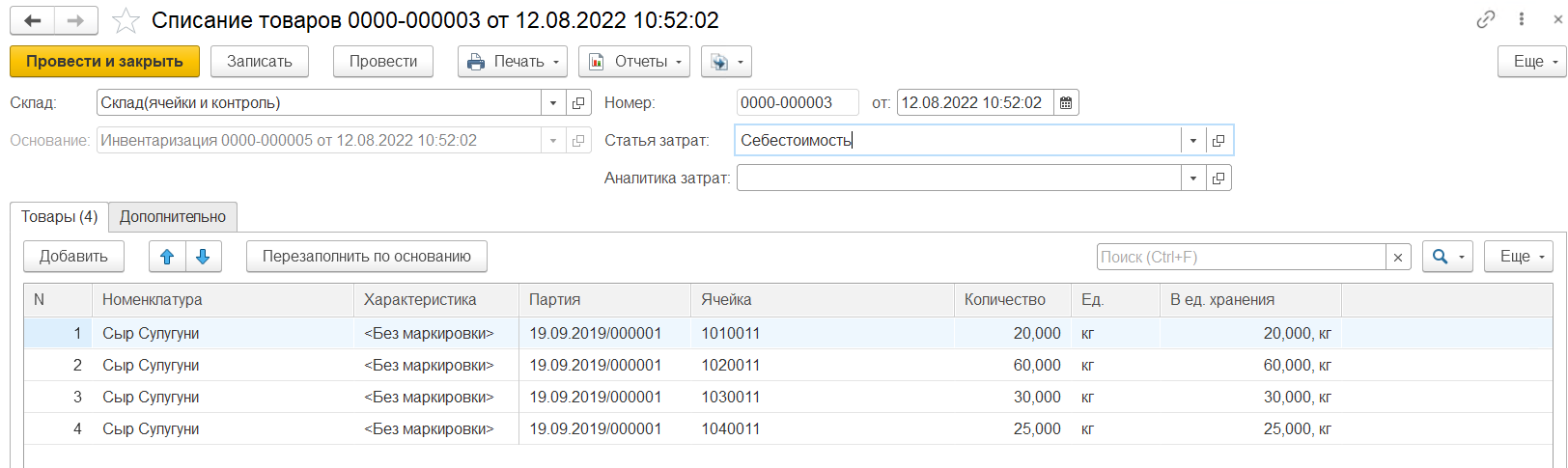 Затем по товарам у которых обнаружена разница между количеством по учету и количеством по факту создаются документы: