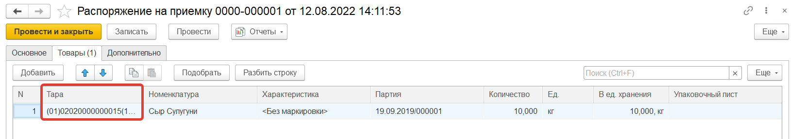 Для оформления поступлений и фиксации штрихкодов упаковок, для дальнейшего отслеживания, необходимо в документе "Распоряжение на приемку" заполнить Тару для поступающей продукции.