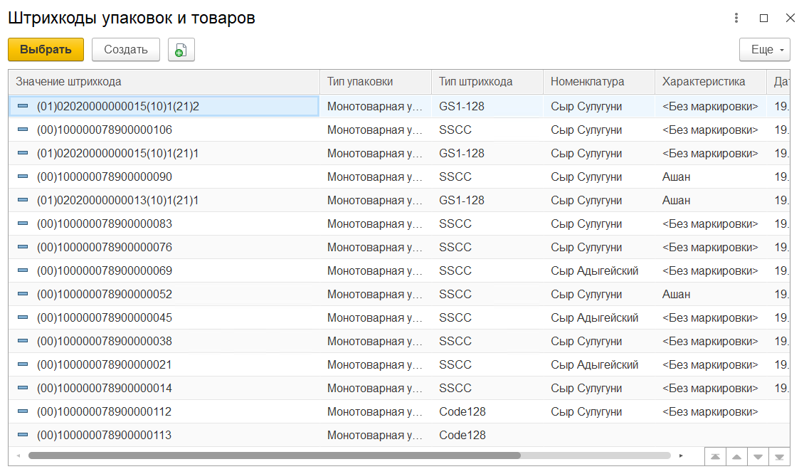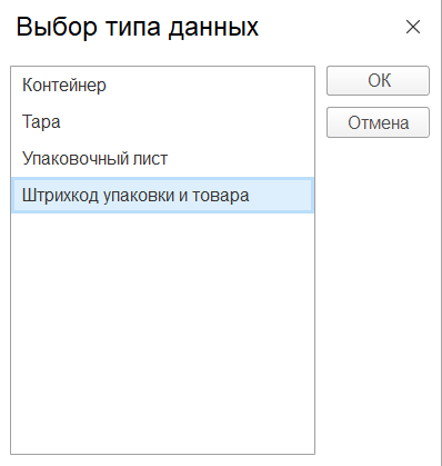 В открывшемся окне указать тип данных "Штрихкоды упаковок и товаров"