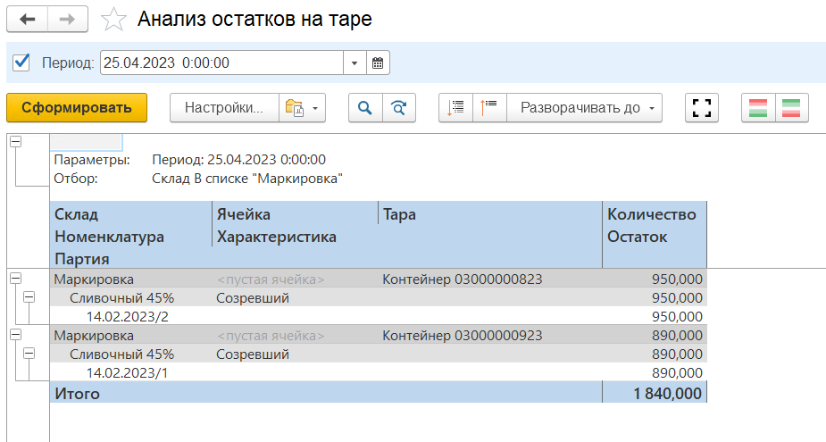 Информацию по товарам с учетом тары можно отследить в отчете "Анализ остатков на таре"