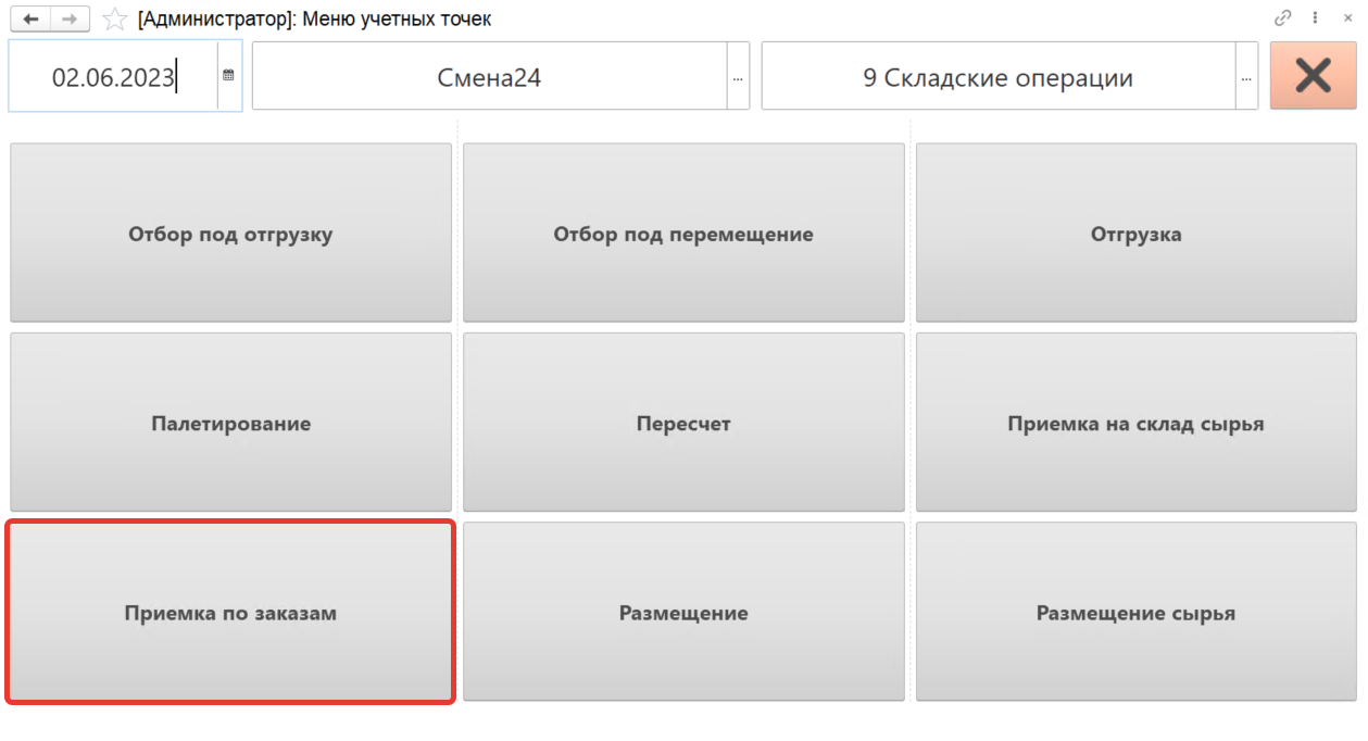 На форме обработки появятся кнопки выбранной учетной точки, выбираем кнопку "Приемка по заказам".