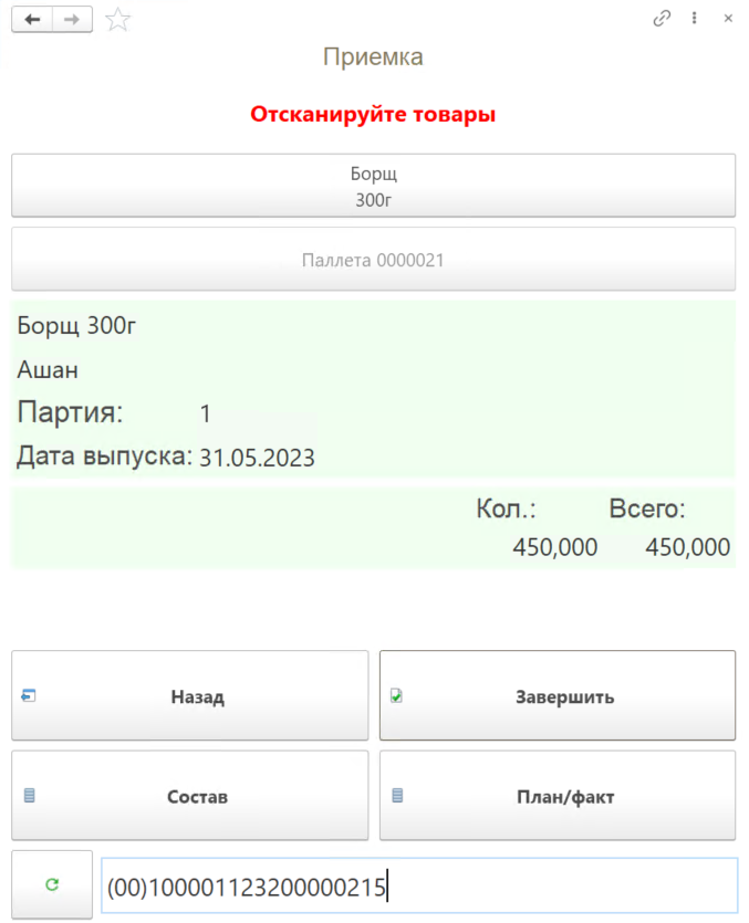 Далее сканируем штрихкод короба поступившей на склад продукции, номенклатура появится на форме.