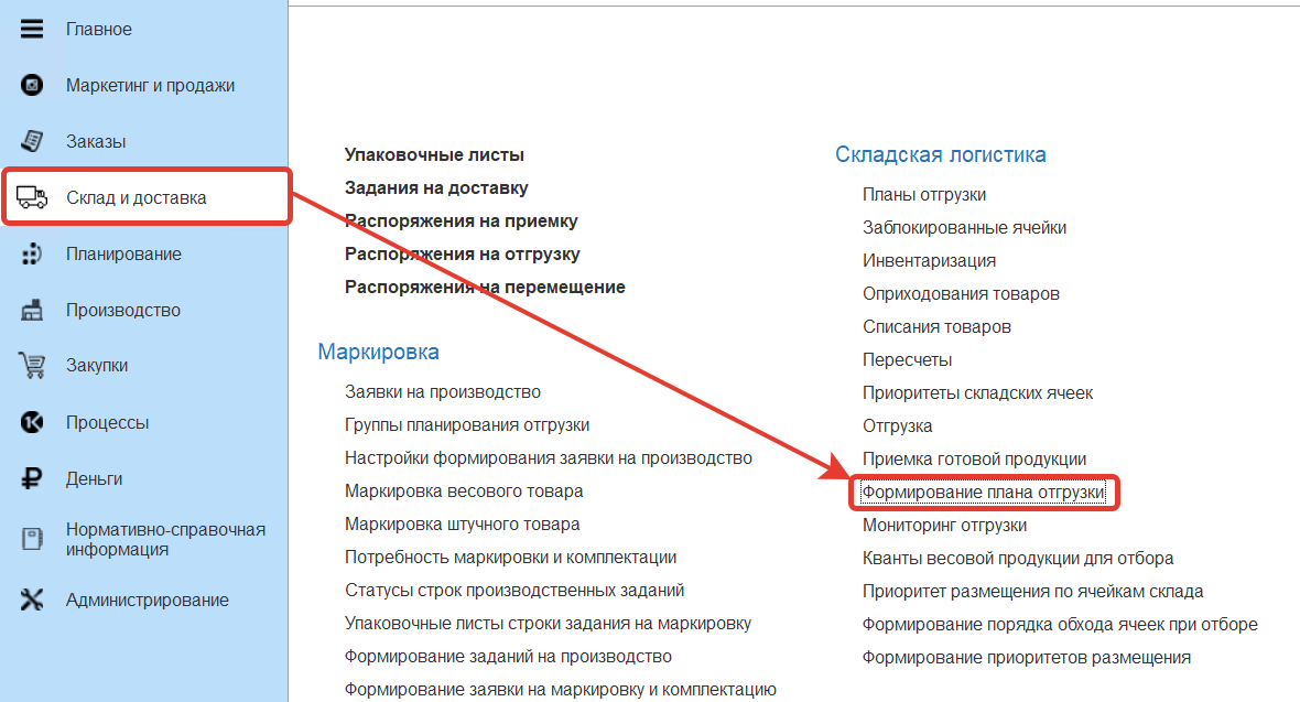 Для создания планов отгрузки используется вкладка "Формирование распоряжений" обработки "Формирование плана отгрузки", которая расположена в разделе "Склад и доставка" в подсистеме "Складская логистика".