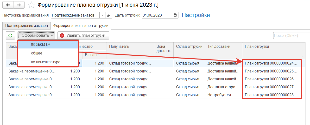 По выбранным заказам формируем планы отгрузки, используя кнопку "Сформировать", выбираем один из вариантов:
