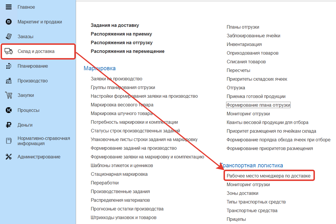 Для распределения планов отгрузки по машинам используется обработка "Рабочее место менеджера по доставке", которая расположена в разделе "Склад и доставка" в подсистеме "Транспортная логистика".