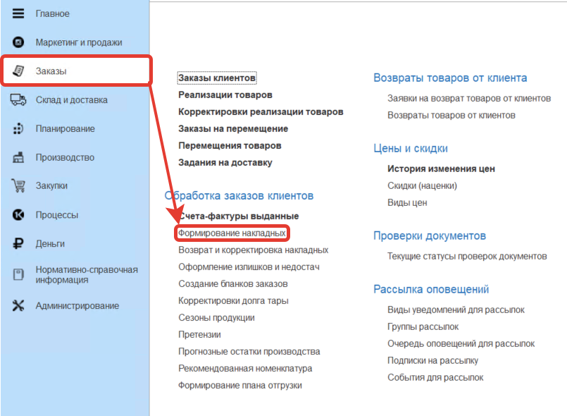 Чтобы отразить перемещение между складами в финансовом контуре необходимо сформировать "Перемещение товаров" используется вкладка "Формирование накладных" одноименной обработки, которая расположена в разделе "Заказы" в подсистеме "Обработка заказов клиентов".