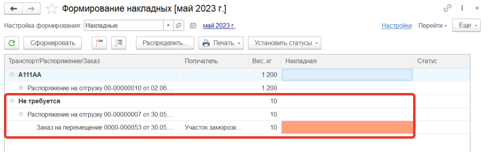 Затем нажимаем кнопку "Обновить", на форме будут выведены "Задания на доставку" по которым были созданы "Распоряжения на отгрузку" и группировка "Не требуется" для распоряжений без доставки.
