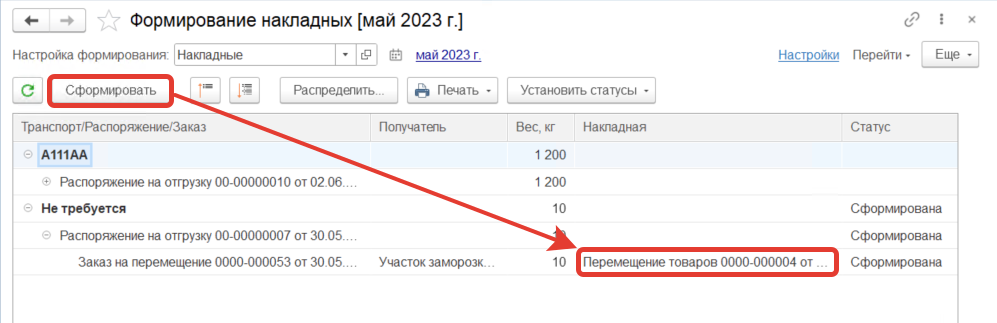 Документы "Перемещения товаров" будут созданы после нажатия кнопки "Сформировать".